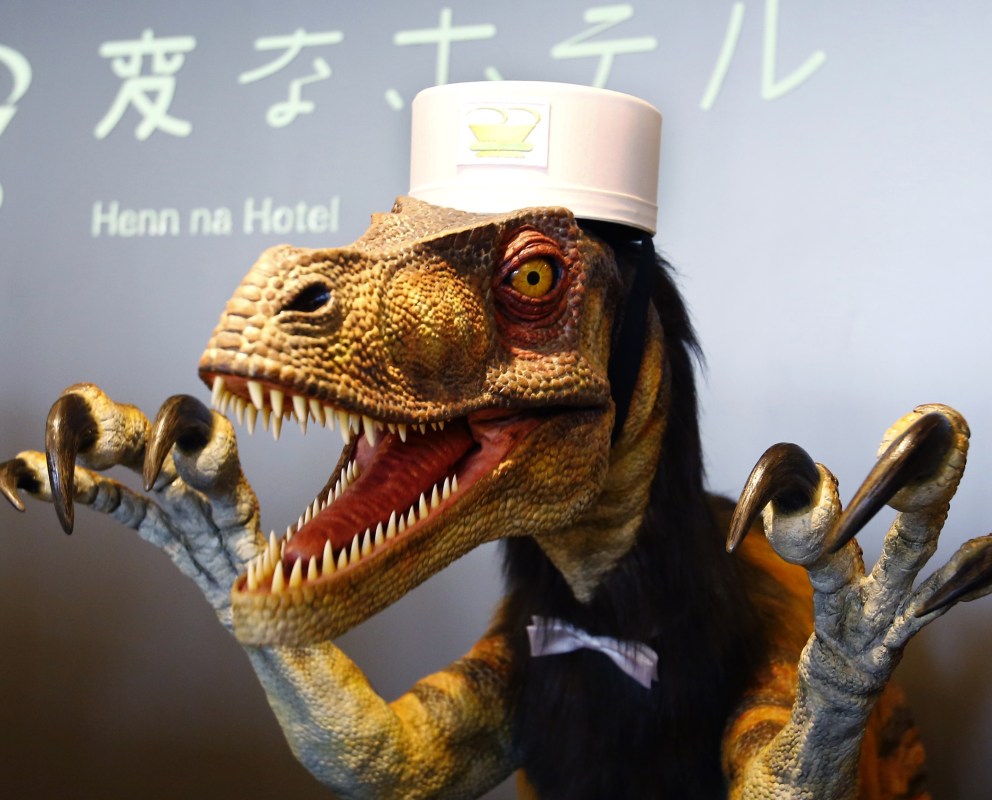 You could be checked-in by robot staff in Henna Hotel at Nagasaki in Japan. You could be served by a dinosaur staff as well 😉